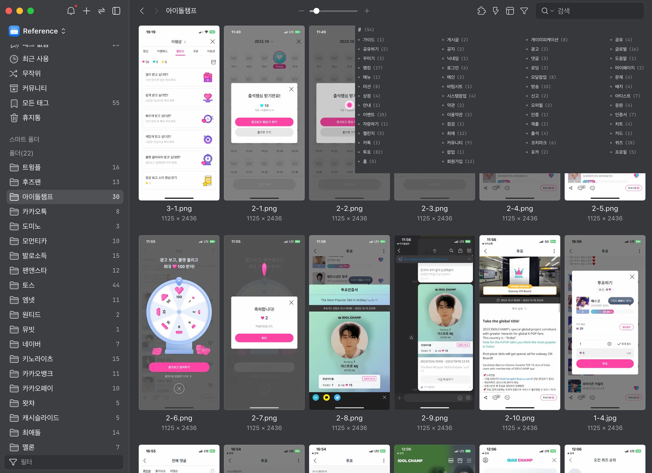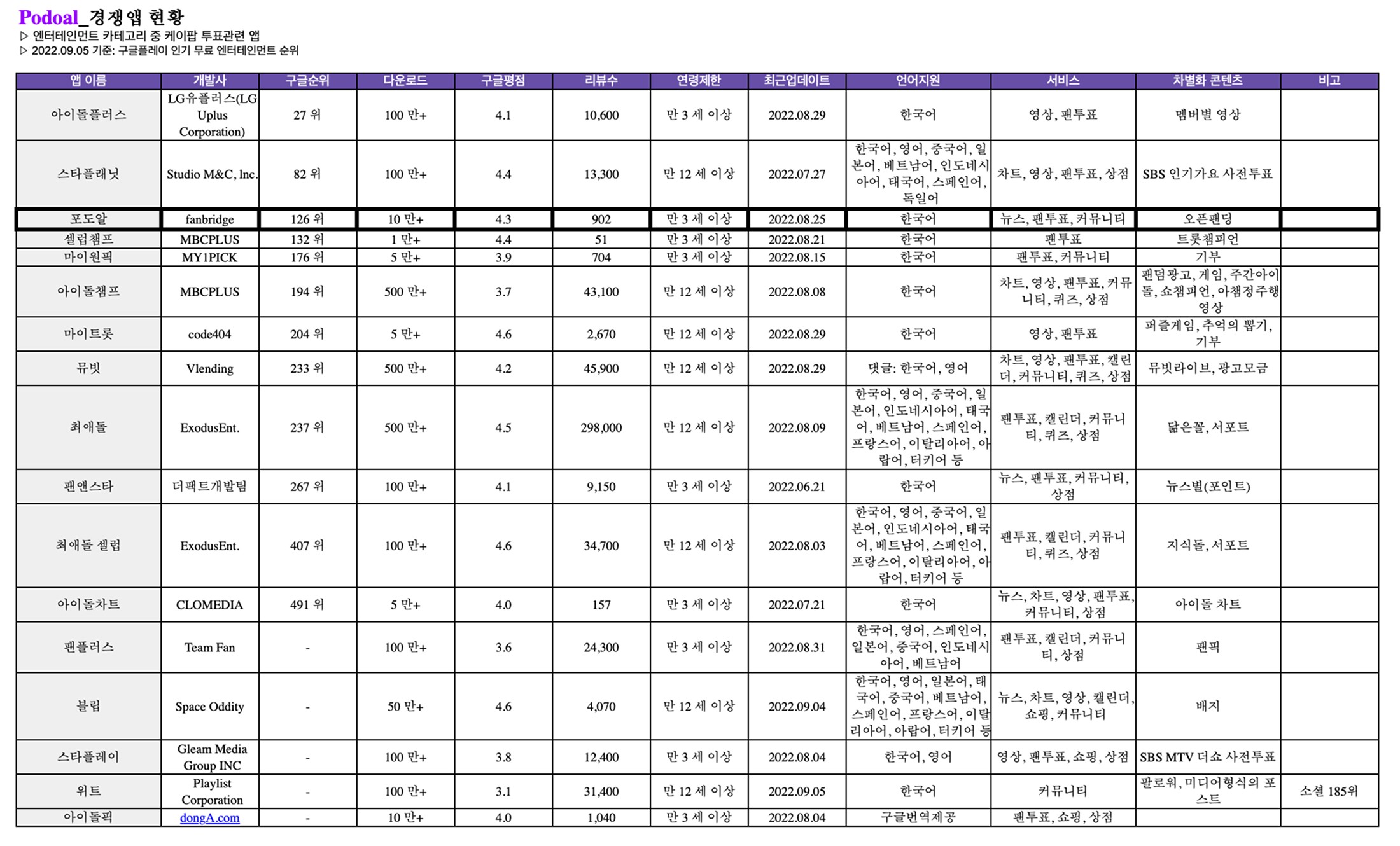 다른 경쟁앱들도 커뮤니티가 존재하지만, 최신글이 없으며 유령 회원들로 구성되어있고 팬 투표를 위한 포인트를 얻기 위해 무분별한 글 작성으로 커뮤니티의 기능을 상실한 것을 알 수 있었습니다.