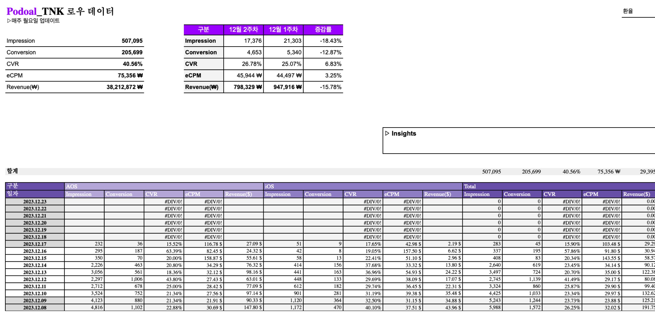 신규 유저 유입도 중요하지만, 기존 유저의 리텐션율을 높일 수 있도록 저해 요소, 이탈 요인들을 파악하여 개선하였고, 광고 매체의 업데이트로 광고 매출이 떨어질때는, 앱 내 광고 노출 로직을 변경하여 매출을 개선하였고 각 상품별로 운영중인 콘텐츠들의 상관관계 파악하여 전환율을 높일 수 있도록 노력하였습니다.